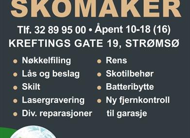 Vi har åpnet nytt skomakerverksted der vi hjelper deg med mye forskjellig! Vi reparerer sko, vesker glidelåser mm. Kopierer nøkler, graverer skilt, bytter batterier, tar imot rens og selger Isbrodder og tilbehør til sko. Vi har lås og beslag og lager ny fjernkontroll til garasjeport!