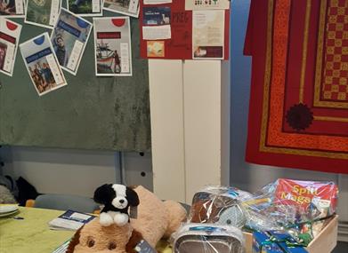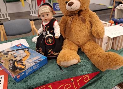 Felles Misjonsbasar for flere foreninger med loddsalg, lynlodd, lykkehjul - gevinster for barn, kafè, og samlingstunder med sang/andakt