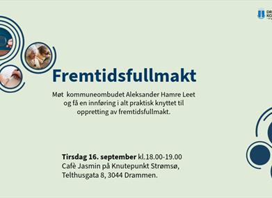 Møt oss tirsdag 16.september klokken 18.00 - 19.00 i Cafè Jasmin på knutepunkt Strømsø, Telthusgata 8, 3044 Drammen.