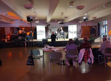 Til en hyggelig helaften med middag, noe godt i glasset, revy og dans.