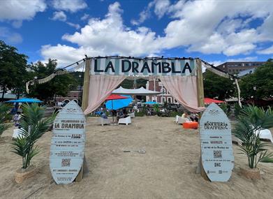 På La Drambla finner du behagelige loungemøbler, parasoller og stor sandhaug og strandleker for barna. Strandloungen har også kafébord for å nyte medbrakt piknik-kurv eller for take-away mat man kan kjøpe fra serveringsstedene rundt torget.