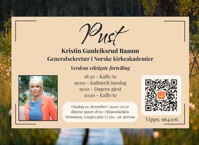 Onsdag 10. desember inviteres du til foredrag med Kristin Gunleiksrud Raaum. Hun er generalsekretær i Norske kirkeakademier og utgitt flere bøker om bibelfortelling og betydningen av bibelen. Velkommen til foredrag om "Verdens viktigste fortelling."
