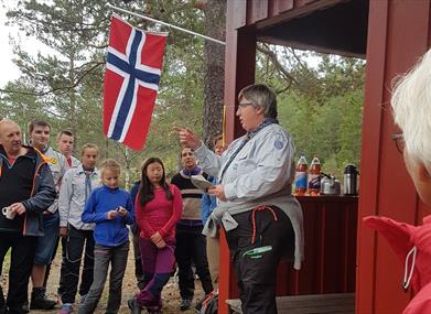 Opplev Austadmarka naturreservat. Åpen speiderhytte med servering av vafler, kaffe og saft.