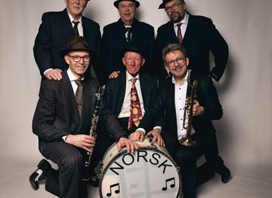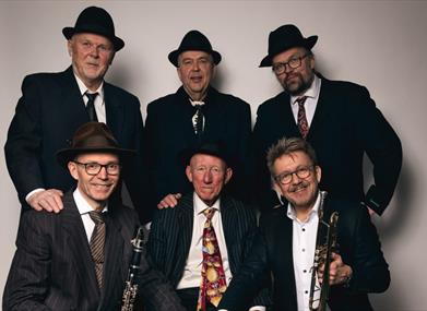 tradisjonelle fra 1920-tallet, med klarinett, trombone, trompet, banjo, tuba og