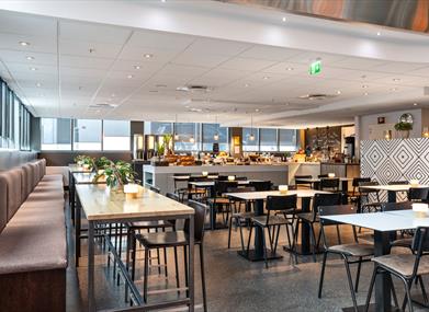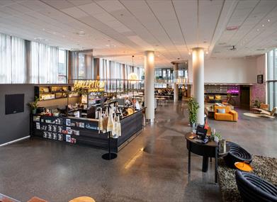 Småsulten eller keen på noe godt å drikke? Kom til vår lobbybar og prat med våre hyggelige kolleger. Her finnes flere enkle retter å velge mellom. Vår restaurant serverer lunsj og middag på forhåndsbestilling. Selvsagt inngår frokostbuffé med et godt økologisk utvalg når du bor hos oss.