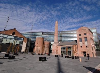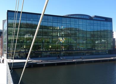 Ved foten av Ypsilon-brua finner du Drammensbiblioteket over tre etasjer. I første etasje finner du kafé, hyggelige sitteplasser, intimscene, frøbibliotek og de nyeste bøkene. I andre etasje finner du scene, mer bøker og arbeidsplasser. I tredje etasje er det område for ungdom, flere studieplasser, flere bøker, du kan låne laptop, skrive ut dokumenter, besøke barne- og småbarnsavdeling og Hollenderiet med studieplasser, elektrisk piano, LP-plater, hobbybøker og formidlingskrok.